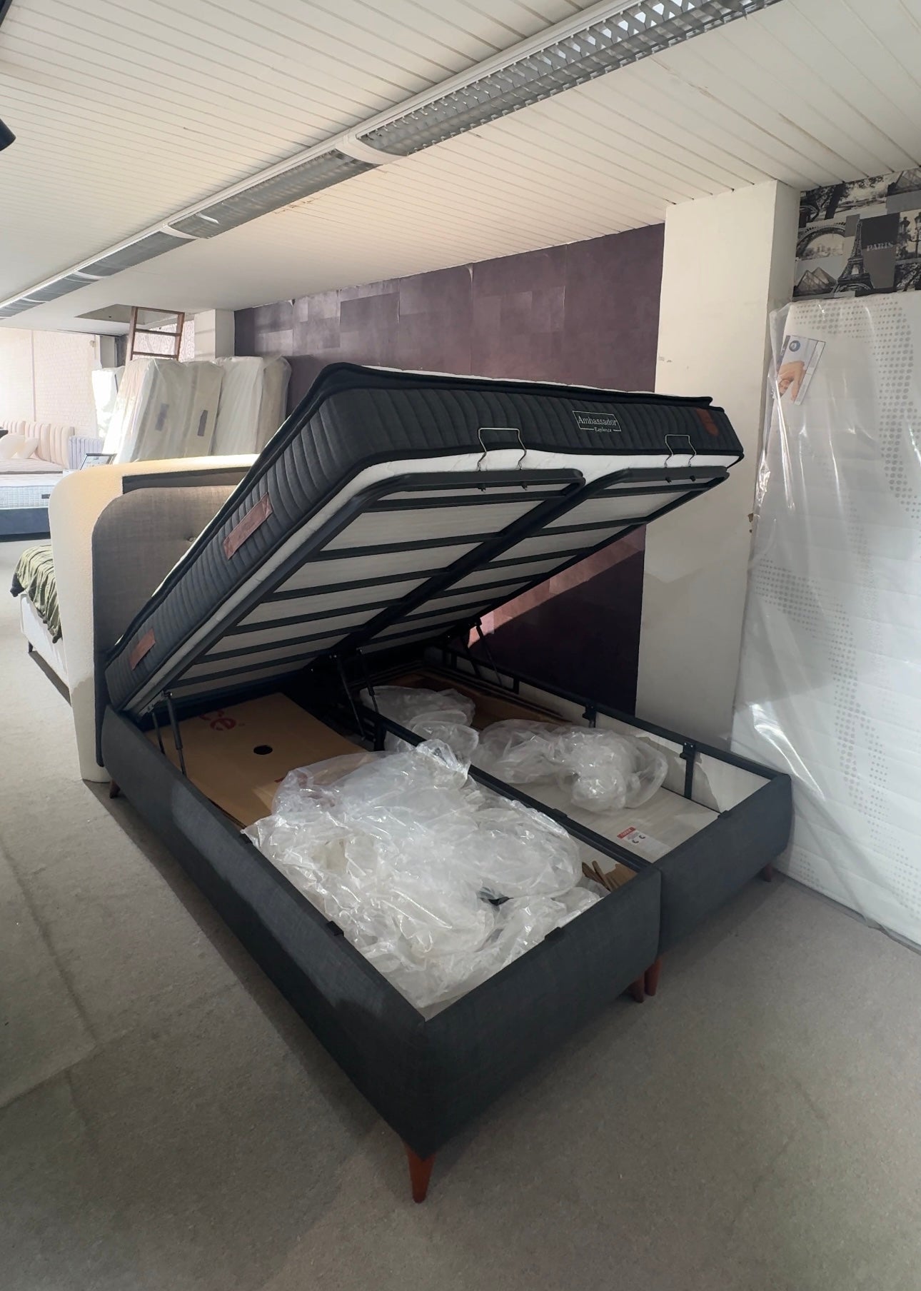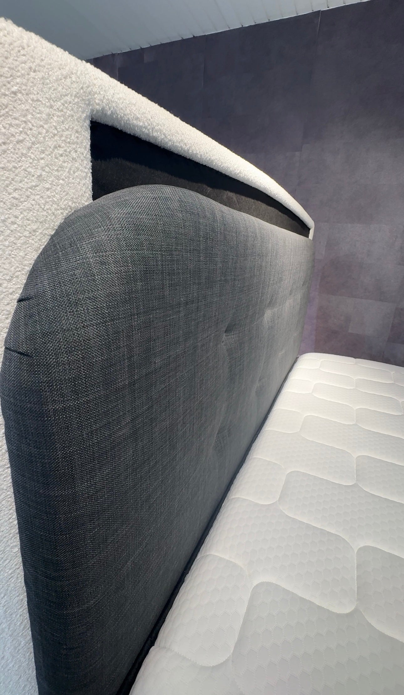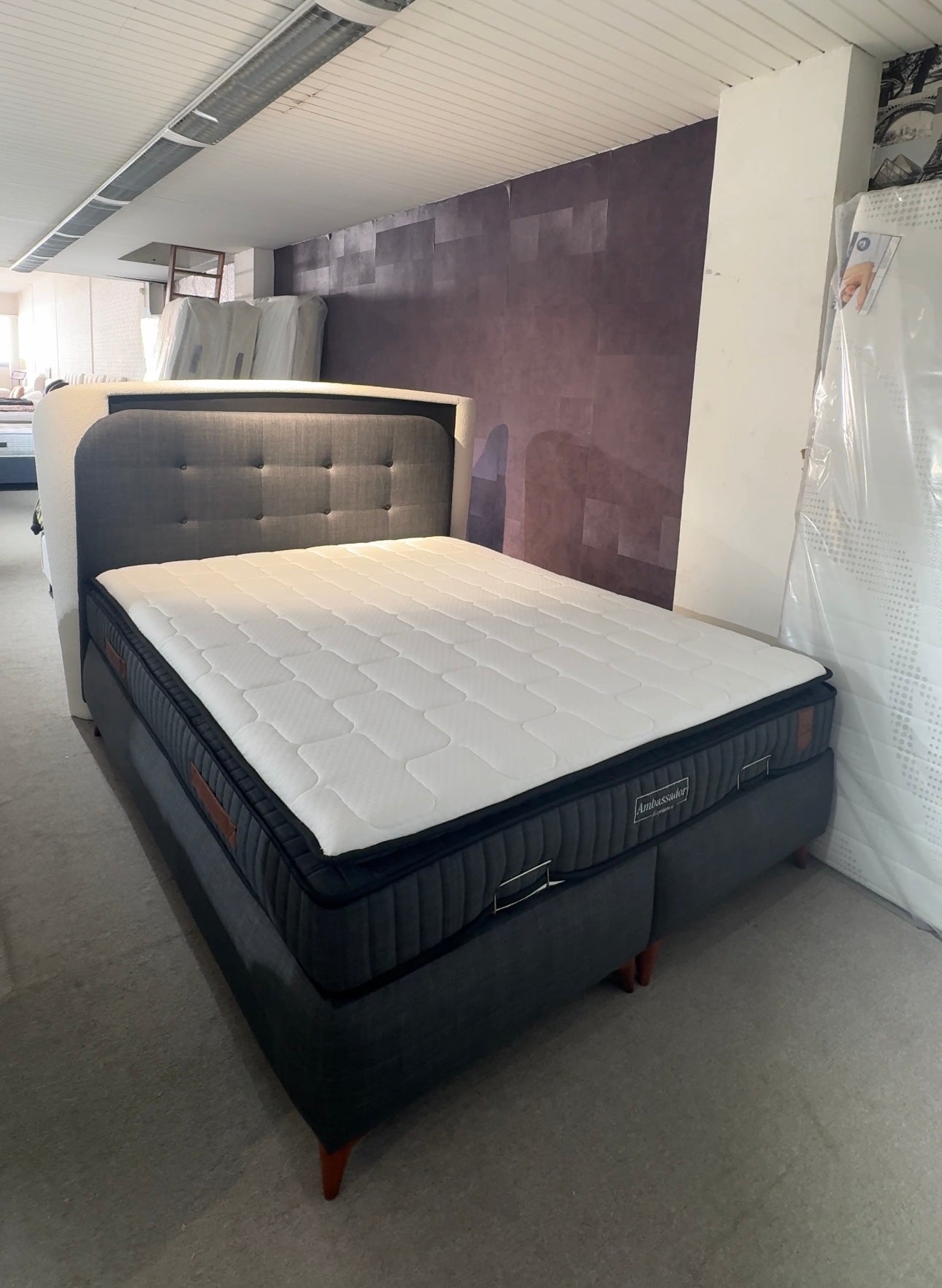Ervaar koninklijk slaapcomfort met het Ambassador bed , een perfecte combinatie van stijl, ondersteuning en luxe. Dit bed is volledig bekleed in een elegante donkergrijze stof en afgewerkt met een gecapitonneerd hoofdbord dat zowel modern als tijdloos oogt.