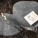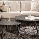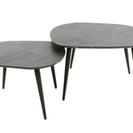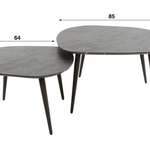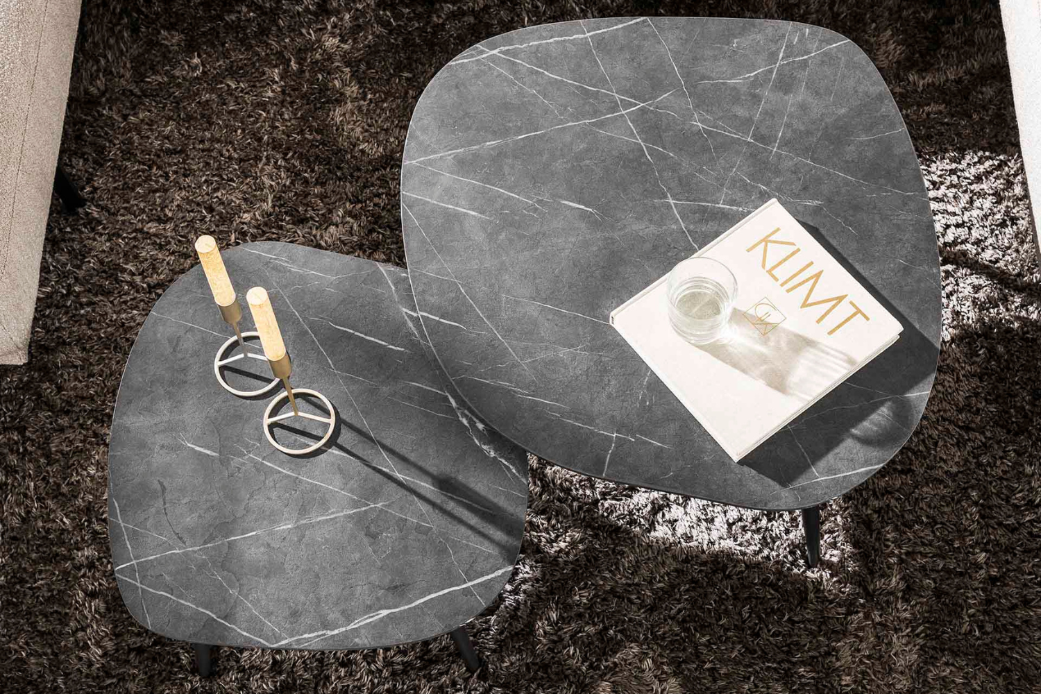 Deze organische salontafel set van 2 is uitgevoerd in melamine met een keramiek uitstraling en frame in staal. De tafel is haast niet te onderscheiden van een keramiek tafel. Het handgemaakte tafelblad is voorzien van een laagje melaminehars dat is aangebracht op hout. Het materiaal wordt door hitte en druk aangebracht. Het prachtige materiaal in combinatie met de organische vorm, geeft een trendy, maar tegelijk ook tijdloze tafel.