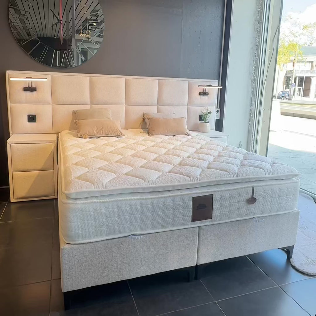 Inclusief 2 nachtkasten + Orthopedisch matras met Topper + Opbergruimte + Ledverlichting + USB-C oplaadfunctie aan beide kanten